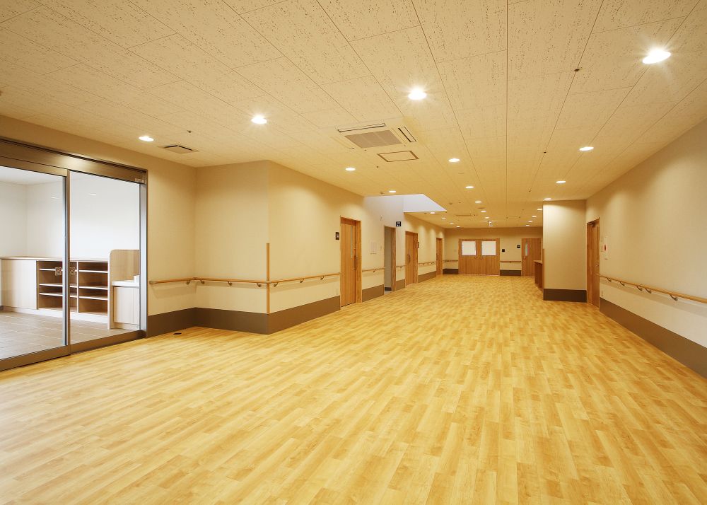 大空間を確保するためネイルプレートトラスが採用された。事務室、厨房、共有スペース等で使用する所には最大12m超のネイルプレートトラスを使用し、柱の無いすっきりとした広い空間を実現した。