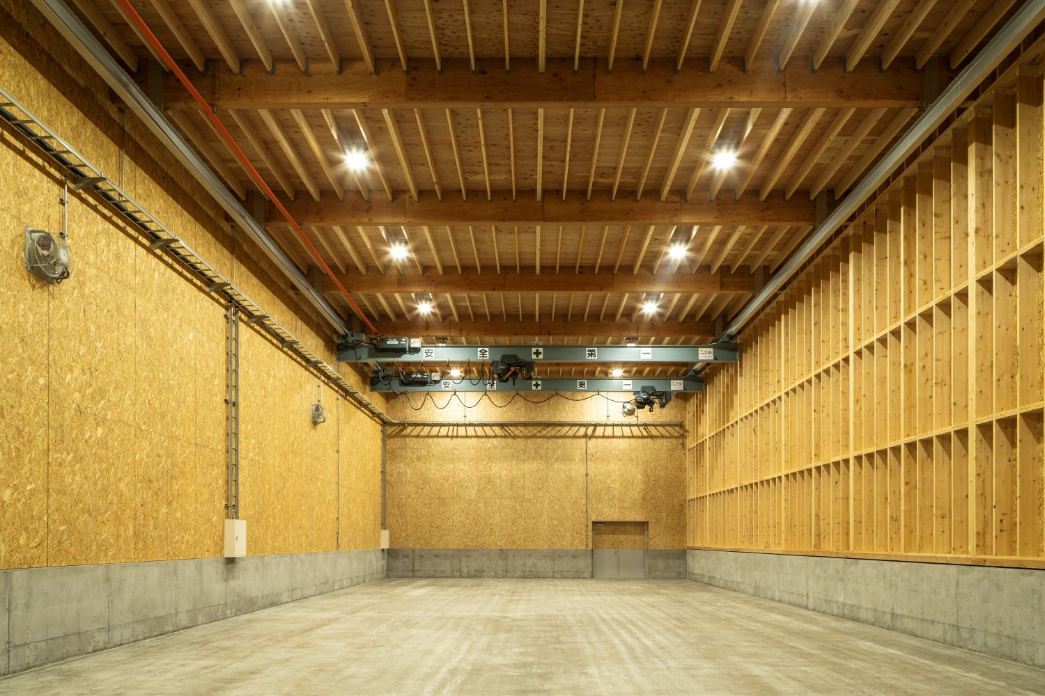 愛媛県松山市の工業団地に建設されたツーバイフォー工法による倉庫兼作業場。構造計算のうえ、移動式クレーンを木造の構造躯体に設置した。JAS構造用LVL140E1級の38ミリx607ミリx12メートル、38ミリx505ミリx12メートル、同LVL用の特注のBH金物を用いている。トラスを使用せず最長11.8メートルのスパンを提案し、コスト的な優位性を発揮している。外壁のスタッドに210を用い、壁厚は235ミリある。